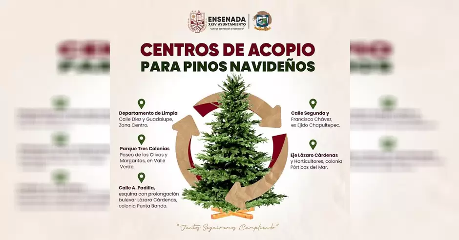 ENSENADA.- Con el fin de evitar que las familias dejen los árboles de Navidad fuera de sus casas o en predios baldíos, el Gobierno de Ensenada, habilitará Centros de Acopio a partir del 8 de enero en cinco puntos distribuidos por diferentes zonas de la ciudad.