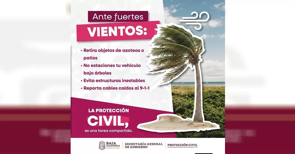 TIJUANA.-La Coordinación Estatal de Protección Civil (CEPC), con base en información del Servicio Meteorológico Nacional (SMN), advierte a la ciudadanía ante vientos fuertes pronosticados para diversos puntos de la región en el transcurso de la semana.