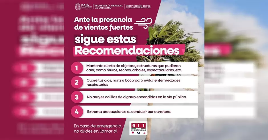 El Gobierno de Baja California, encabezado por Marina del Pilar Avila Olmeda, a través de la Secretaría General de Gobierno, encabezada por Alfredo Álvarez Cárdenas, exhorta a llamar al número de emergencias 9-1-1, en caso de ser necesario, el cual se encuentra activo las 24 horas del día.