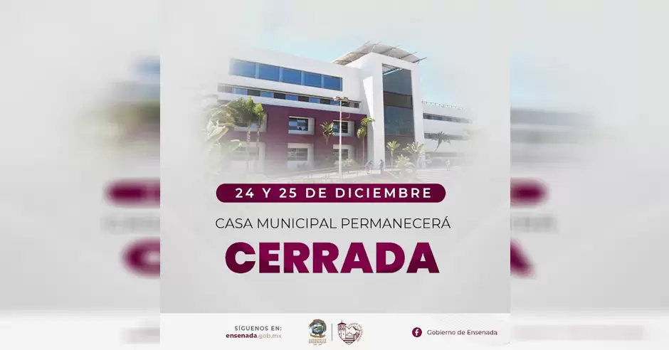 ENSENADA.- Con motivo de la celebración de Nochebuena y Navidad, el Gobierno de Ensenada que preside Claudia Agatón Muñiz informa a la población que los días 24 y 25 de diciembre permanecerán cerradas las oficinas de la Casa Municipal.