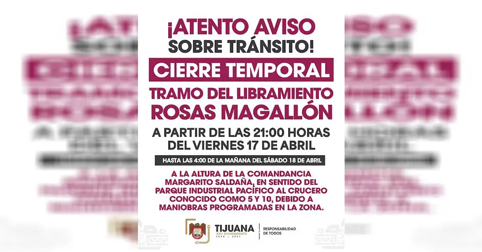 TIJUANA.- A partir de las 21:00 horas de este viernes 17 de abril, el XXV Ayuntamiento de Tijuana, llevará a cabo el cierre temporal de un tramo del Libramiento Rosas Magallón, a la altura de la comandancia Margarito Saldaña, en sentido del Parque Industrial Pacífico al crucero conocido como 5 y 10, debido a maniobras programadas en la zona.