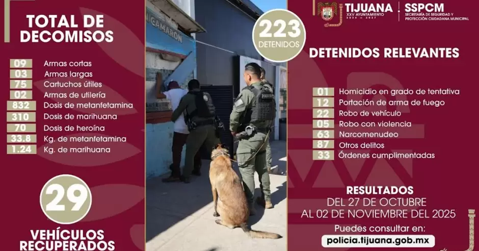 TIJUANA. La Secretaría de Seguridad y Protección Ciudadana Municipal (SSPCM), a través de una serie de operativos y acciones preventivas en el periodo comprendido entre el 27 de octubre al 2 de noviembre de este año, obtuvo como resultado la detención de 223 personas por diversos delitos.