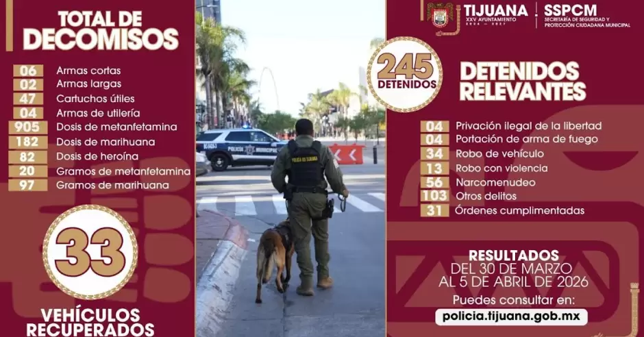 TIJUANA.- La Secretaría de Seguridad y Protección Ciudadana Municipal (SSPCM), mediante la Policía Municipal, informa sobre el aseguramiento de 245 personas presuntamente vinculadas a diversos delitos, así como la incautación de ocho armas de fuego y más de mil dosis de sustancias prohibidas, en un periodo comprendido del 30 de marzo al 5 de abril del presente año.