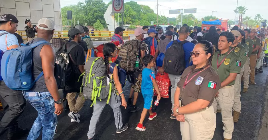 La caravana migrante camina por la carretera Costera escoltados por la Guardia Nacional y Policía Estatal de Caminos, así como una ambulancia de Protección Civil de Chiapas con paramédicos y cuatro unidades del Instituto Nacional de Migración (INM) y Beta Sur.