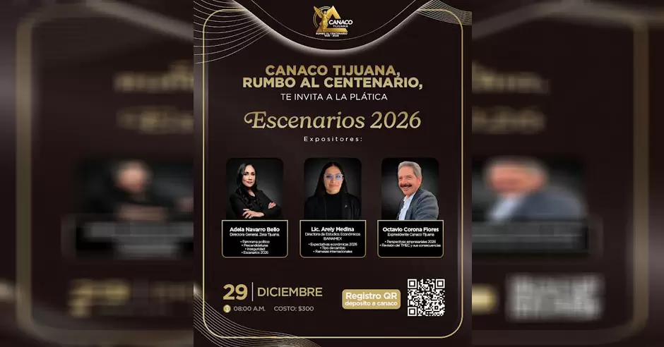 TIJUANA.- El presidente de la Cámara Nacional de Comercio (Canaco), Olivaldo Paz Gómez, anunció la plática "Escenarios 2026", con la ponencia de tres personalidades: Adela Navarro Bello, Arely Medina y Octavio Corona Flores.