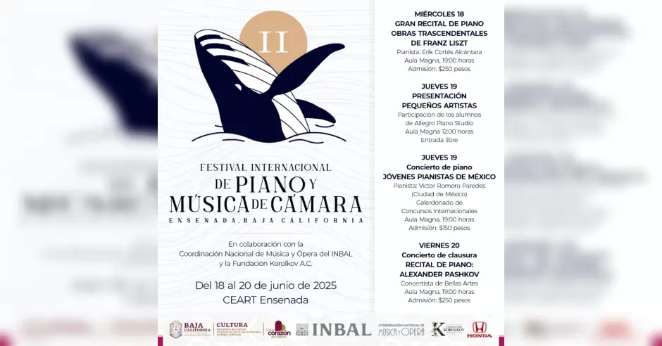 ENSENADA.- El Centro Estatal de las Artes Ensenada (CEART Ensenada), en colaboración con la Fundación Korolkov A.C., se complace en anunciar la segunda edición del Festival Internacional de Piano y Música de Cámara, que se llevará a cabo del 18 al 20 de junio en el recinto cultural.