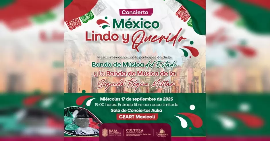 En Mexicali, se ofrecerá el concierto México Lindo y Querido con la participación de la Banda de Música del Estado y la Banda de Música de la Segunda Región Militar, quienes rendirán un homenaje a la música mexicana. La cita es el miércoles 17 de septiembre, a las 19:00 horas, en la Sala de Conciertos AUKA del CEART.