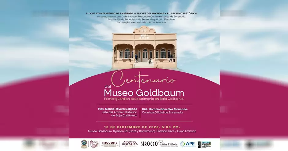 ENSENADA.- El Gobierno de Ensenada, a través del Imcudhe y el Archivo Histórico, en coordinación con Café Sirocco, el Patronato Centro Histórico de Ensenada y Urban Sketchers Ensenada, invitan a la celebración del centenario del edificio conocido como Museo Goldbaum. Inaugurado en 1925 como Museo Regional de Ensenada, este inmueble es considerado el primer museo de Baja California.