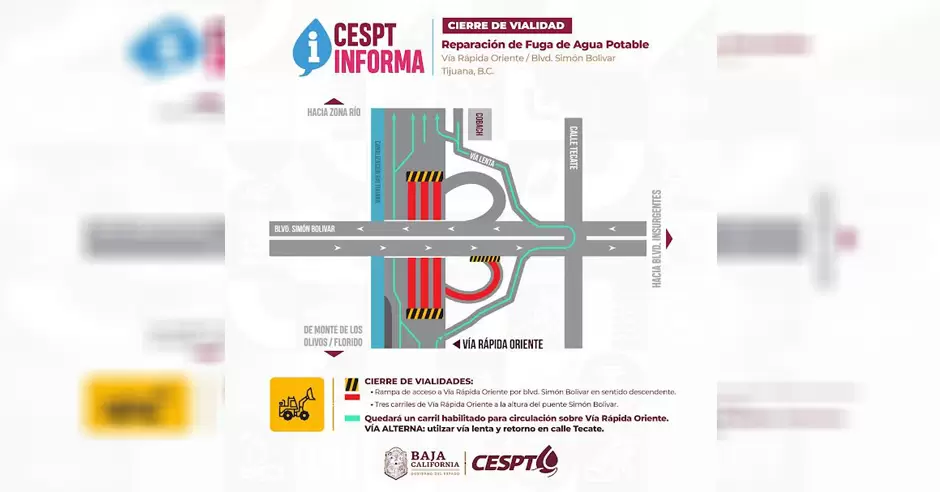 TIJUANA.- Este viernes 13 de marzo a las 10:00 pm y hasta mañana sábado 14 de marzo a las 4:00 pm, la CESPT realizará trabajos de reparación en una tubería de agua potable ubicada en los carriles centrales de la Vía Rápida Oriente, a la altura del puente Simón Bolívar, frente al fraccionamiento Alba Roja.