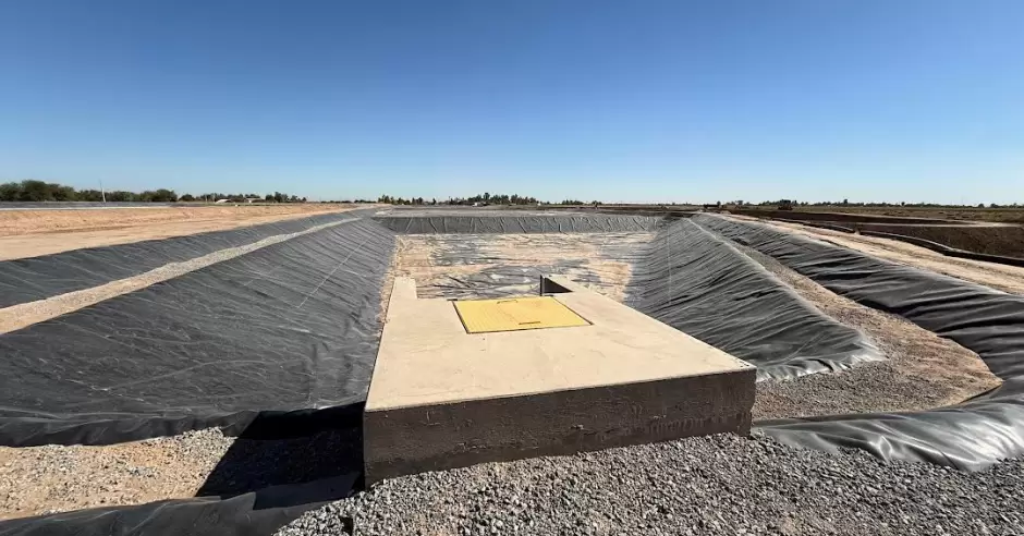 La Comisión Estatal de Servicios Públicos de Mexicali (CESPM) construye una tarquina retenedora de sólidos, que es un depósito diseñado para contener el azolve de las lagunas de la Planta de Tratamiento de Aguas Residuales Guadalupe Victoria "km 43".