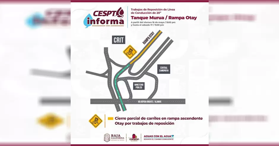 TIJUANA.- La Comisión Estatal de Servicios Públicos de Tijuana (CESPT) informa que hoy, viernes 16 de mayo, se llevarán a cabo trabajos de rehabilitación en la línea de conducción de agua potable del Tanque Murúa, a partir de las 20:00 horas, donde se instalarán 24 metros de tubería de hierro dúctil de 20 pulgadas de diámetro, en el tramo ubicado sobre la rampa ascendente hacia Otay, a la altura de la central camionera, en la Avenida Rápida Alamar.