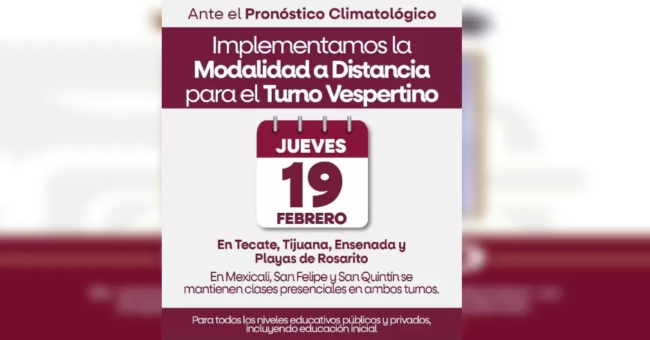 BAJA CALIFORNIA.- Madres y padres de familia: el día de hoy jueves 19 de febrero, en los municipios de Tijuana, Tecate, Playas de Rosarito y Ensenada, el turno vespertino será en modalidad a distancia debido a las lluvias que se esperan el resto del día.