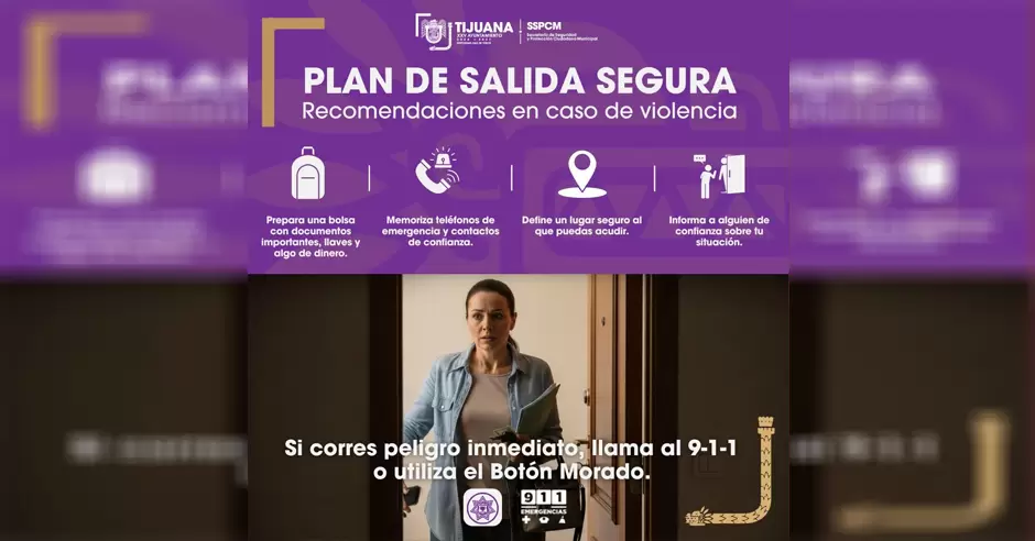TIJUANA.- Con el objetivo de brindar herramientas prácticas que permitan a las mujeres actuar de manera oportuna ante una situación de riesgo, la Secretaría de Seguridad y Protección Ciudadana Municipal (SSPCM), promueve el "Plan de Salida Segura", una guía preventiva para proteger la integridad física y emocional de las víctimas de violencia.