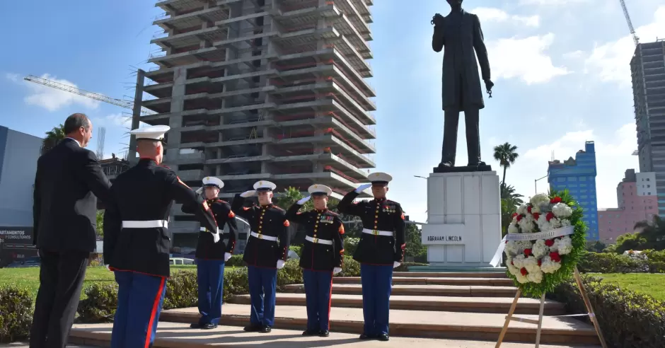 TIJUANA.- En el marco del Día de los Presidentes, el cónsul general de Estados Unidos en Tijuana, Christopher Teal, participó en una ceremonia frente a la estatua de Abraham Lincoln en la ciudad, en colaboración con The White House Historical Association y acompañado por integrantes del Cuerpo de Infantería de Marina.