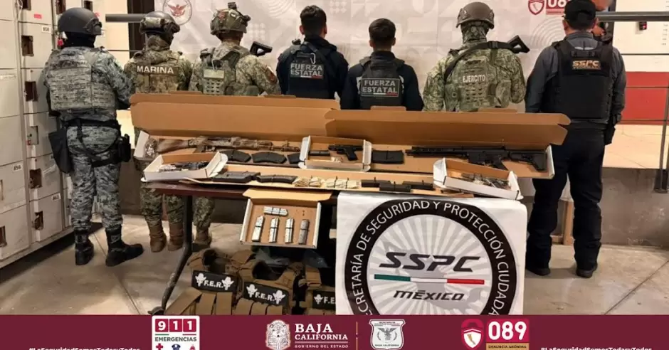 TIJUANA.- Armamento de alto poder y blindaje corporal con insignias alusivas a un grupo criminal fueron asegurados por agentes de la Fuerza Estatal de Seguridad Ciudadana (FESC) en conjunto con elementos de la Secretaría de Marina (MARINA), Ejército Mexicano, Guardia Nacional y Secretaría de Seguridad y Protección Ciudadana (SSPC) federal; el despliegue se activó tras el reporte de individuos exhibiendo equipo bélico e ingiriendo bebidas alcohólicas en el fraccionamiento Valle de las Palmas.