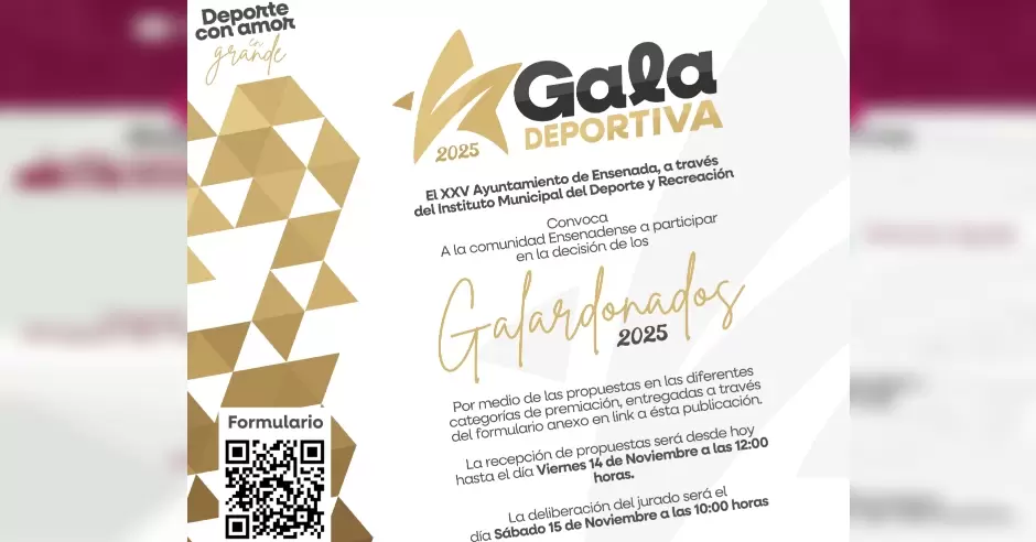 ENSENADA.- El gobierno de la presidenta Claudia Agatón Muñiz, a través del Instituto Municipal del Deporte y Recreación de Ensenada invita a la comunidad ensenadense a formar parte del proceso de selección de los Galardonados 2025, dentro del marco de la Gala Deportiva.