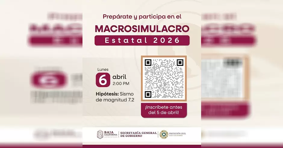 TIJUANA.- Con el objetivo de fortalecer la cultura de la prevención y medir la capacidad de respuesta ciudadana en un escenario distinto al habitual, la Coordinación Estatal de Protección Civil (CEPC) invita a la población, instituciones y sector privado a sumarse al Macrosimulacro Estatal 2026, el cual, en un hecho inédito, se llevará a cabo de manera simultánea en todo el estado el próximo lunes 6 de abril a las 14:00 horas.