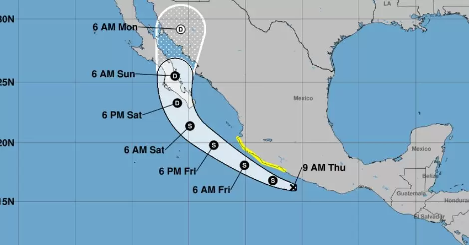 En el reporte de las 9:00 horas, se indicó que el fenómeno ocasionará lluvias torrenciales en el suroeste y la costa de Guerrero, así como en la costa de Michoacán; intensas en el norte y suroeste de Oaxaca; muy fuertes en Colima, y fuertes en Jalisco.