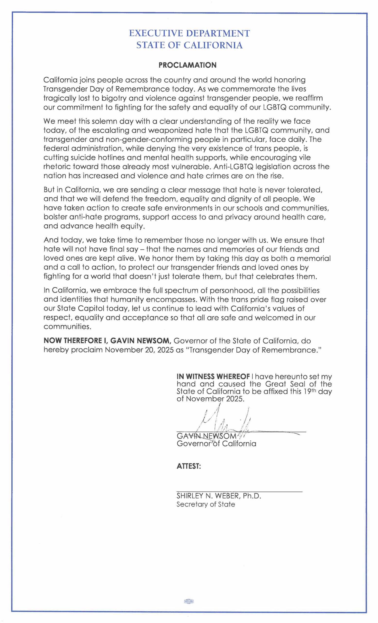 POR LO TANTO, YO, GAVIN NEWSOM, Gobernador del Estado de California, proclamo por la presente el 20 de noviembre de 2025 como el "Día de la Memoria Transgénero".