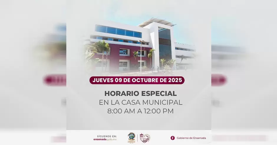 ENSENADA.- El Gobierno de Ensenada informa que, el jueves 9 de octubre, las dependencias ubicadas en la Casa Municipal, brindarán servicio hasta las 12 del mediodía.