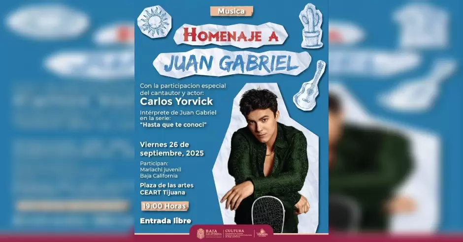 Así lo informó la Coordinadora del CEART Tijuana, Karla Quirós, quien afirmó que se contará con la participación de Carlos Yorvick, cantautor y actor originario de la ciudad de Tijuana, reconocido por su interpretación de Juan Gabriel en la exitosa serie Hasta que te conocí, quien le volverá a dar vida al ícono mexicano en el evento, con las canciones más representativas de todos los tiempos.