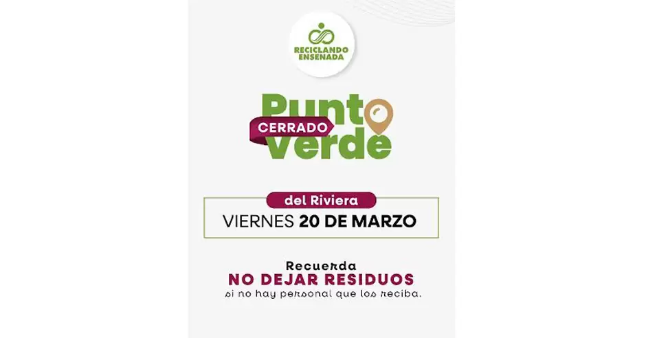 ENSENADA.- El Gobierno de Ensenada informa que debido a la realización de un evento turístico, el viernes 20 de marzo el Punto Verde Riviera permanecerá cerrado.
