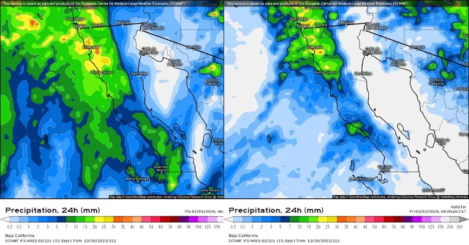 Esta condición meteorológica ocasionará probabilidad de rachas fuertes de viento, lluvias fuertes a muy fuertes e intervalos de chubascos en nuestro estado, así como la probabilidad de caída de nieve o aguanieve durante la noche en la sierra de San Pedro Mártir. Se prevé que, durante la tarde del jueves 1 de enero, la vaguada comience a debilitar, disminuyendo la intensidad de las precipitaciones.