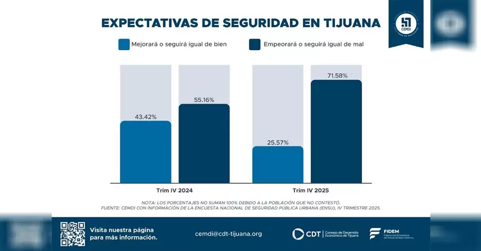 TIJUANA.- Con la reciente publicación de la Encuesta Nacional de Seguridad Pública Urbana (ENSU), el Centro Metropolitano de Información Económica y Empresarial (CEMDI) elaboró un análisis de los principales resultados en la ciudad de Tijuana al cuarto trimestre del 2025.
