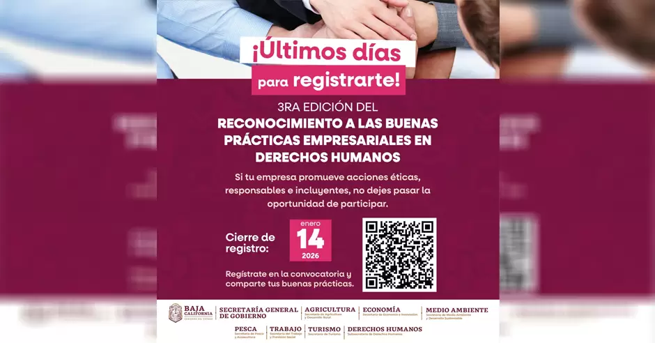 TIJUANA.- En el marco de la conmemoración internacional del Día de los Derechos Humanos, y siguiendo la encomienda de la gobernadora Marina del Pilar Avila Olmeda de consolidar una cultura de respeto y dignidad en todos los sectores, el Gobierno del Estado anuncia la ampliación del periodo de registro para la 3ra Edición del Reconocimiento a las Buenas Prácticas Empresariales en Derechos Humanos.