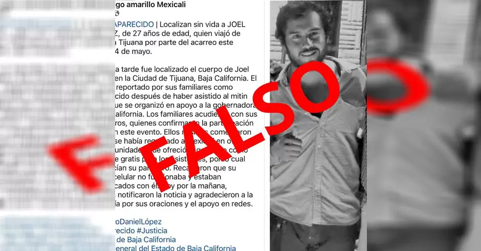 BAJA CALIFORNIA.- La Fiscalía General del Estado de Baja California, tras realizar las investigaciones correspondientes, informa que, no se cuenta con registro ni denuncia por la desaparición de la persona de nombre Joel Sánchez de 27 años de edad originario de la ciudad de Mexicali.