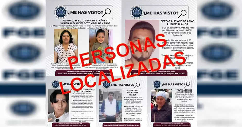 Las personas localizadas son: Joaquín Eleazar Mendoza García, de 17 años; Yolanda Torres Limón, de 46 años; Guadalupe Soto Vidal, de 17 años; Yhiren Alexander Soto Vidal, de 4 años, Edgar Cruz Rodríguez, de 43 años; y Sergio Alejandro Arias Luis, de 34 años.