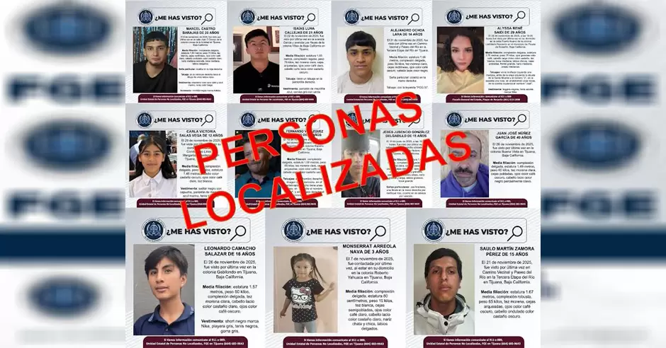Las personas localizadas son: Marcel Castro Barajas, de 20 años; Isaías Luna Callejas, de 21 años; Alejandro Ochoa Lara, de 14 años; Alyssa René Saidi, de 29 años; Carla Victoria Salas Vega, de 12 años; Fernando Velázquez Hidalgo, de 44 años; Jesús Jubencio González Delgadillo, de 15 años; Juan José Núñez García, de 49 años; Leonardo Camacho Salazar, de 16 años; Monserrat Arreola Nava, de 3 años, y Saulo Martín Zamora Pérez, de 15 años de edad.