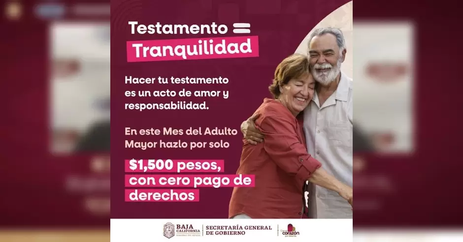 Gracias a esta iniciativa, implementada en coordinación con el Colegio de Notarios del Estado, las personas mayores de 60 años pueden elaborar su testamento en cualquier notaría del estado por un costo preferencial de $1,500 pesos, con el propósito de brindar certeza jurídica y tranquilidad a las familias bajacalifornianas.