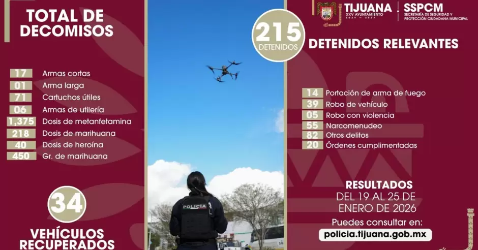 TIJUANA.- La Secretaría de Seguridad y Protección Ciudadana Municipal (SSPCM), ha intensificado sus esfuerzos en la prevención y protección de la ciudadanía, logrando la detención de 215 personas presuntamente implicadas en diversos delitos en el periodo del 19 al 25 de enero del presente año. Este logro es el resultado de la implementación de una estrategia de seguridad liderada por el presidente municipal de Tijuana, Ismael Burgueño Ruiz, junto con diversas iniciativas destinadas a fortalecer la operatividad en toda la ciudad.