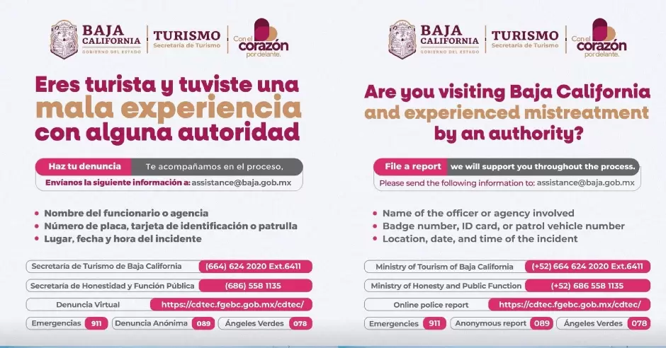 De igual manera, están disponibles los siguientes medios de atención: 911 para emergencias, 089 para denuncias anónimas, 078 para asistencia vial por parte de Ángeles Verdes, así como el teléfono (664) 624 2020, extensión 6411, para orientación directa por parte de la Secretaría de Turismo de Baja California.