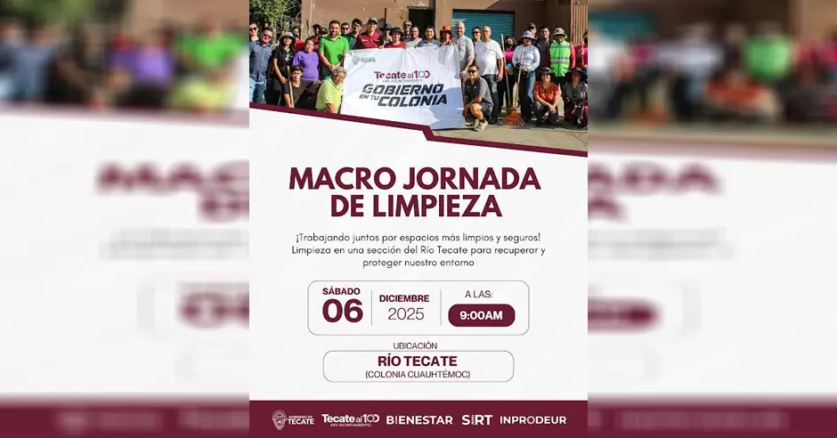 TECATE.- Con el firme compromiso de recuperar, proteger y dignificar los espacios públicos de nuestra ciudad, el Gobierno de Tecate, a través de la Dirección de Bienestar, SIRT e INPRODEUR, convoca a todas y todos los tecatenses a sumarse a la Macro Jornada de Limpieza que se llevará a cabo el próximo sábado 06 de diciembre de 2025 a las 9:00 a.m., en una sección del Río Tecate, ubicada en la colonia Cuauhtémoc.