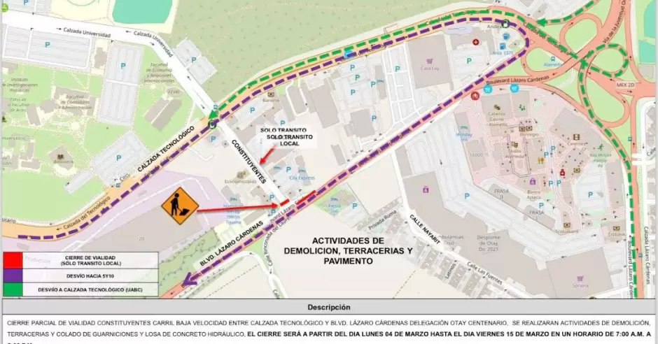 El acceso sobre la vialidad Constituyentes será solo de tránsito local para ingresar a los comercios del área, por lo que el Ayuntamiento de Tijuana solicita a los ciudadanos transitar con moderación por la zona, tomar sus precauciones en tiempos de traslado a sus destinos y por seguridad, evitar la zona de trabajos donde se encontrará la maquinaria pesada con la realización de maniobras.