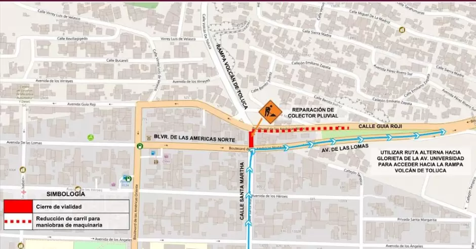 Por lo anterior, se requerirá el cierre temporal de la calle mencionada entre Avenida Guía Roji (Rampa descendente) y Avenida de las Lomas, por un periodo de 12 días primeramente, habilitando rutas alternas donde se confinará a un carril la calle Guía Roji por proceso de obra y maniobras de maquinaria.