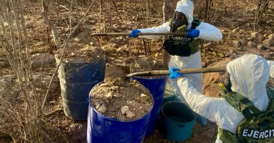 Las autoridades federales informaron que en ese asentamiento se encontró dos tambos de 200 litros de capacidad, en donde se almacenaba una sustancia similar a la acetona, otro, con un contenido que hace presumir que es etanol, un reactor metálico, tela malla-sombra, un tinaco metálico tipo torre, dos ollas y treinta metros de manguera de plástico.