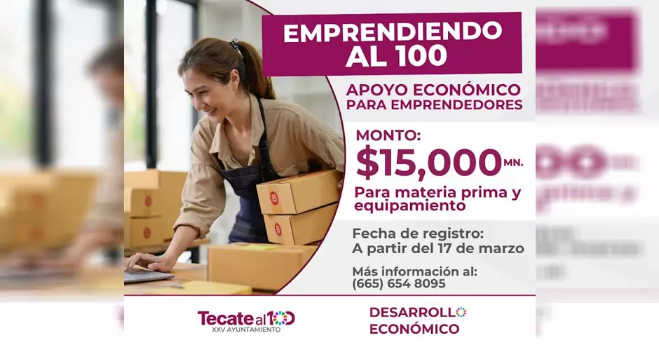 Este programa está dirigido a personas físicas residentes de Tecate que se encuentren iniciando su emprendimiento y cuenten con un máximo de ocho meses de antigüedad en su registro ante el SAT. El apoyo consiste en un subsidio de hasta $15,000 pesos para la adquisición de materia prima y equipamiento, con el objetivo de fortalecer y aumentar la competitividad de las microempresas en el municipio.