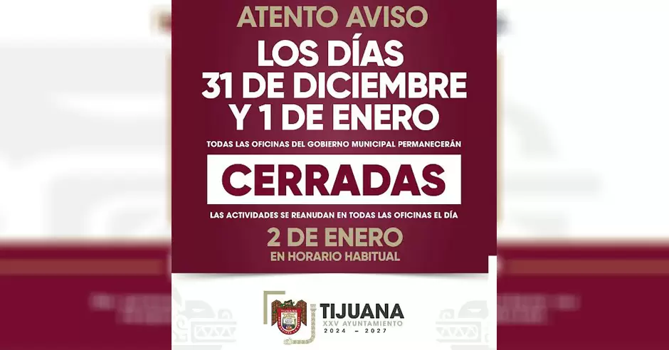 TIJUANA.- El XXV Ayuntamiento de Tijuana, informa que los días miércoles 31 de diciembre de 2025 y jueves 1 de enero de 2026 serán considerados días inhábiles para el personal, por lo que las oficinas ubicadas en Palacio Municipal, delegaciones y dependencias paramunicipales permanecerán cerradas a la atención al público.