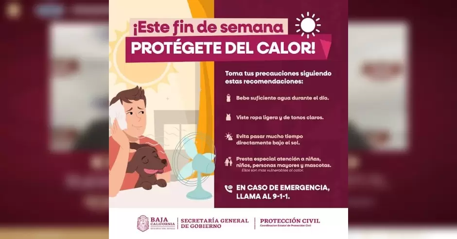 TIJUANA.- La Coordinación Estatal de Protección Civil (CEPC), con base en información del Servicio Meteorológico Nacional (SMN) informa que durante este fin de semana se prevé el aumento de las temperaturas en la región, por lo que exhorta a la ciudadanía a tomar precauciones.