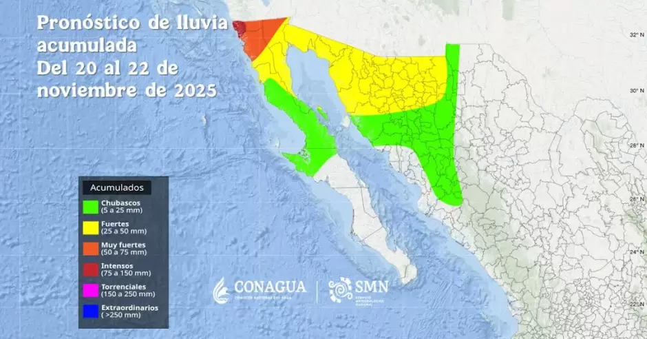 Se prevé ambiente de frío a muy frío con temperaturas mínimas de -10 °C a -5 °C, al igual que heladas y posible nieve o aguanieve, en sierras de Baja California. Asimismo, se esperan vientos de 30 a 40 kilómetros por hora con rachas desde 50 a 70 kilómetros por hora y oleaje de 1.5 a 2.5 metros de altura en la costa occidental de la entidad.