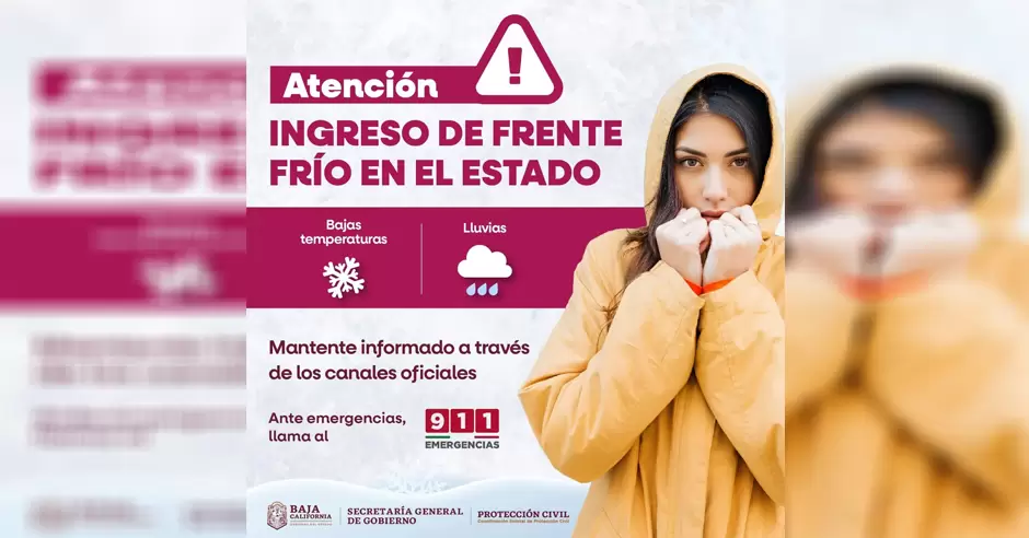 TIJUANA.- La Coordinación Estatal de Protección Civil (CEPC), con base en información del Servicio Meteorológico Nacional (SMN), informa a la población sobre el ingreso del frente frío número 34, el cual impactará con mayor intensidad en la Zona Costa de la entidad.