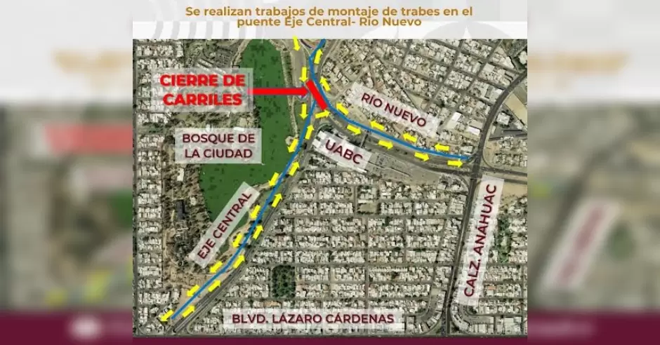 La SIDURT informa que la circulación de Poniente a Oriente, sobre Río Nuevo, será desviada al Eje Central en dirección al bulevar Lázaro Cárdenas.