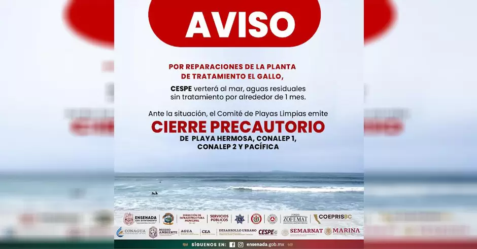 ENSENADA.- A partir de este 21 de noviembre habrá cierre precautorio de las playas Playa Hermosa, Conalep 1, Conalep 2 y Pacífica, debido a que la Comisión Estatal de Servicios Públicos de Ensenada (CESPE) continuará con las labores rehabilitación de la Planta de Tratamiento El Gallo.