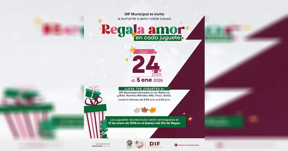 ENSENADA.- La alcaldesa de Ensenada, Claudia Agatón Muñiz, invita a la comunidad en general a participar en la campaña "Regala Amor en Cada Juguete", impulsada por el Sistema para el Desarrollo Integral de la Familia (DIF) Municipal, con el propósito de reunir juguetes que serán entregados a niñas y niños en situación vulnerable durante el tradicional festejo de Día de Reyes, el próximo 13 de enero de 2026.