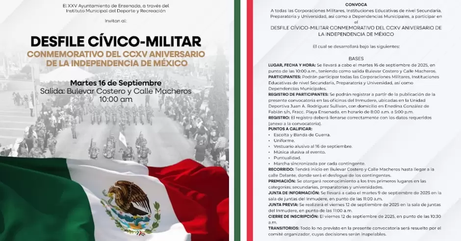ENSENADA.- El próximo viernes 12 de septiembre es la fecha límite para que corporaciones militares e instituciones educativas de nivel secundaria, preparatoria y universidad se registren para participar en el Desfile Cívico-Militar por el CCXV Aniversario de la Independencia de México.