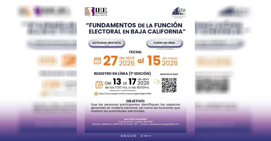 MEXICALI. - El Instituto Estatal Electoral de Baja California (IEEBC), a través de la Comisión Especial de Vinculación con los Consejos Distritales Electorales, invita a la ciudadanía a participar en el curso en línea "Fundamentos de la Función Electoral en Baja California", cuyo objetivo es brindar conocimientos generales en materia electoral y dar a conocer las funciones de las autoridades en este ámbito.