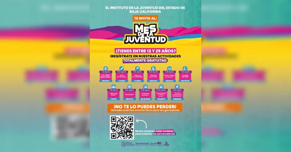 El director de Juventud BC, Francisco Molina, informó que durante agosto, las y los jóvenes bajacalifornianos podrán participar en una serie de actividades conmemorativas al mes de la Juventud, las cuales serán totalmente gratuitas y donde contamos con una bolsa total en premios de 300 mil pesos.